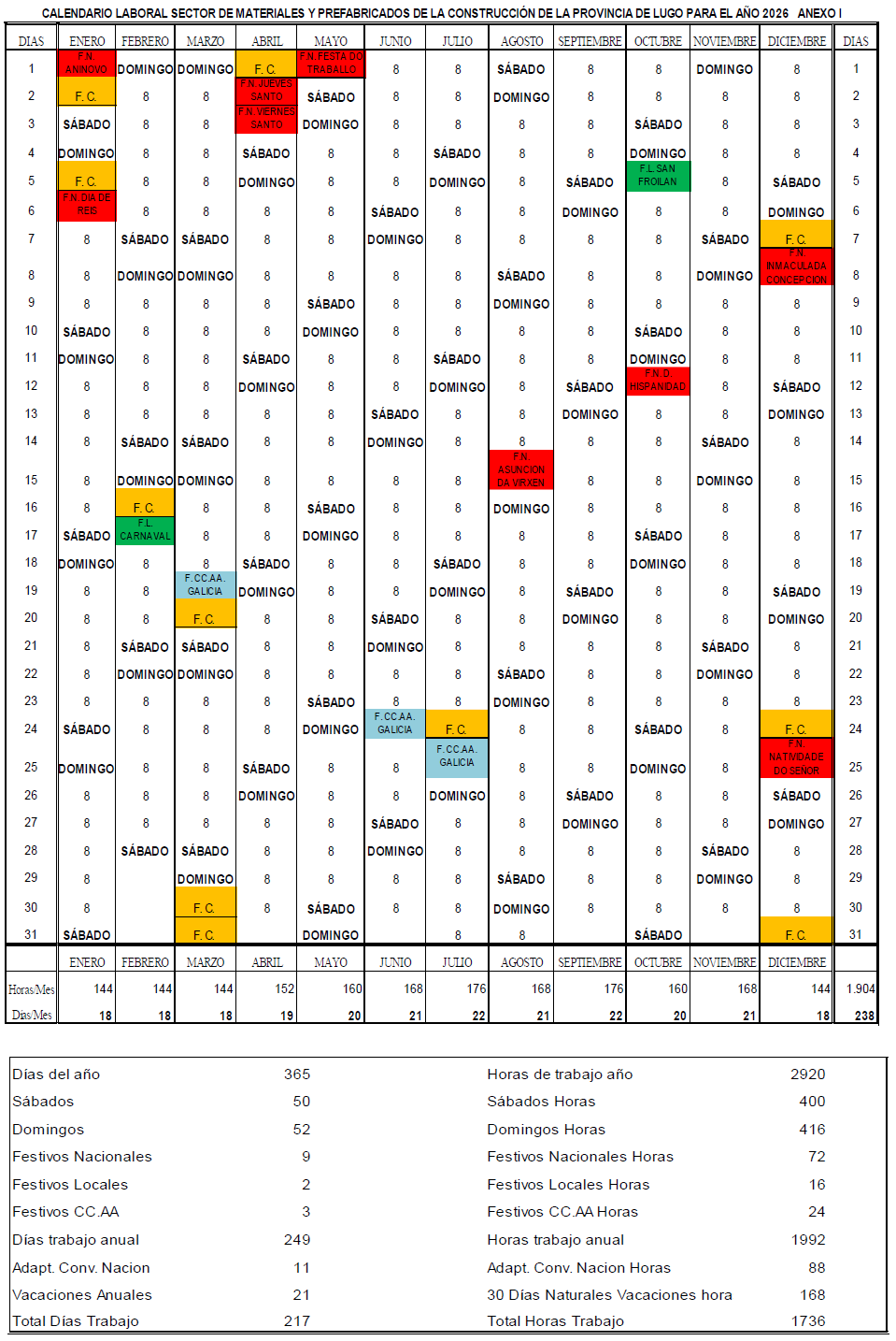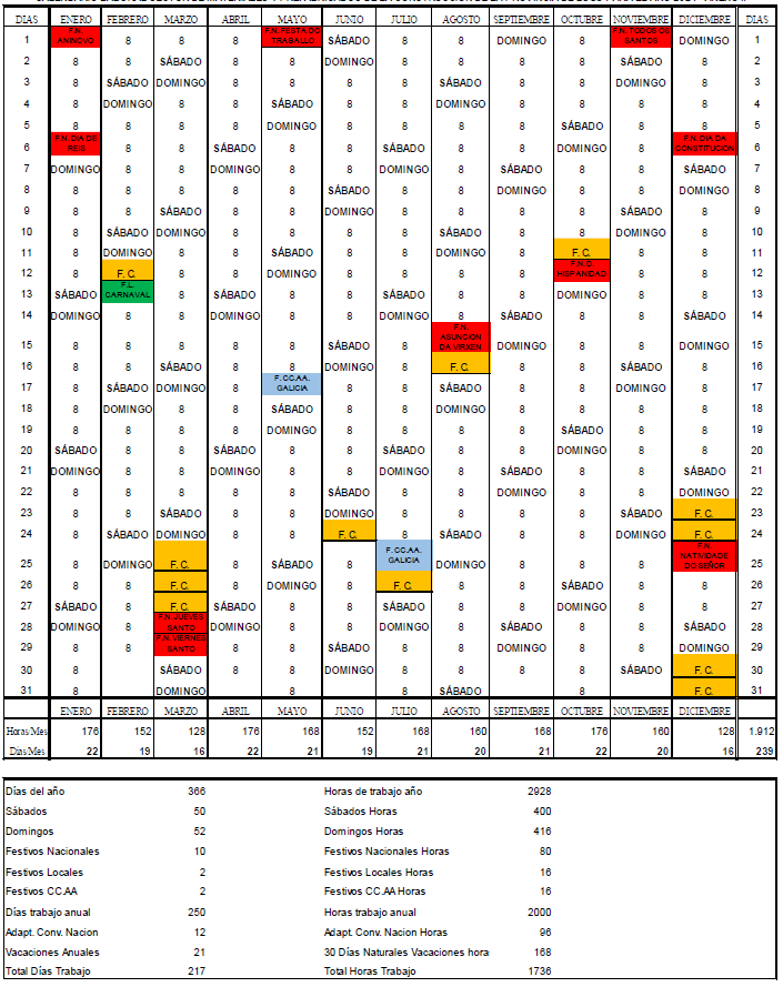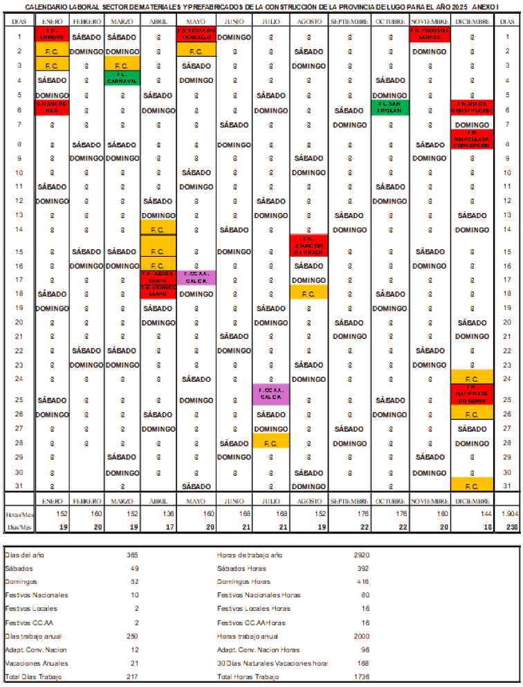 1.- Este sería el calendario que afectaría a toda la provincia (salvando lo dispuesto en el apartado 3). Las fiestas locales, 12 de febrero y 5 de octubre, se refieren al Concello de Lugo. Para el resto de los Concellos serán los que se determinan en el calendario de Fiestas Locales. En aquellos Concellos que el festivo local coincida en sábado/domingo, tendrán un día más de FC (horas cero) para que se adapte la jornada a las 1736 horas, que se señalará por la empresa con acuerdo de las personas trabajadoras.