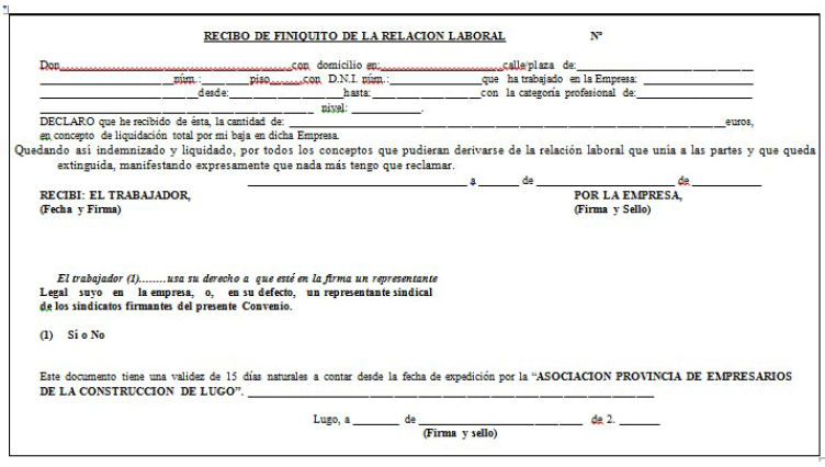 Firman el presente Convenio los representantes sindicales y empresariales que constan en el Acta de negociación y aprobación del Convenio. Y que son: UGT -FICA, CCOO-HABITAT GALICIA por la parte sindical y por la parte empresarial la Asociación Provincial de Empresarios de la Construcción de Lugo.