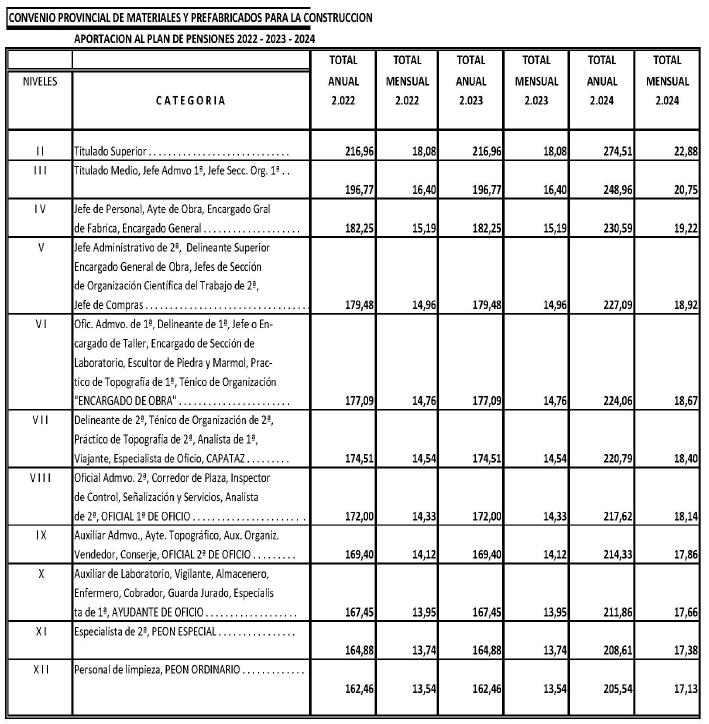 1.- Aprobar la tabla de aportación al plan de pensiones para el CONVENIO INDICADO, y para los años 2022, 2023 y 2024 excepto FCM CIG que no comparece.