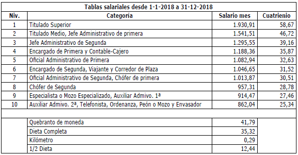 Año 2018: Se pacta un incremento de 20 euros mensuales sobre tablas de 2017, para el nivel 10 el incremento será de 36,67 euros mensuales, siendo las cuantías las previstas en el Anexo I.