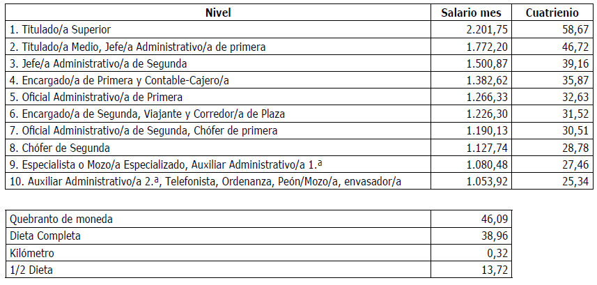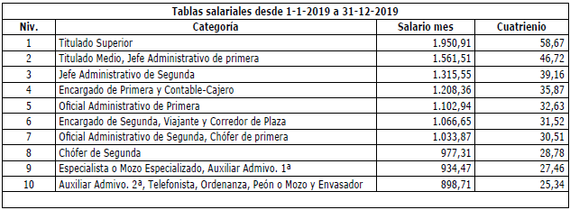 Año 2019: Se pacta un incremento de 20 euros mensuales sobre las aplicables en 2018, para el nivel 10 el incremento será de 36,67 euros mensuales, siendo las cuantías las previstas en el Anexo II.