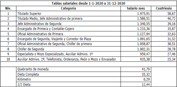 Año 2020: Se pacta un incremento de 25 euros mensuales sobre las tablas de 2019, para el nivel 10 el incremento será de 36,67 euros mensuales, siendo las cuantías las previstas en el Anexo III.