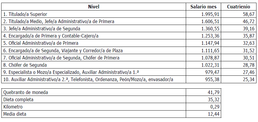 Niveles a título ejemplificativo: Auxiliar Administrativo/a de Segunda, Telefonista, Ordenanza, Peón o Mozo/a, Envasador/a.