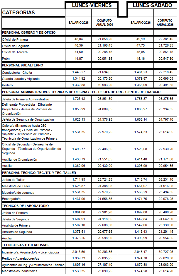 La jornada laboral en cómputo anual será de 1.746 horas repartidas opcionalmente en el seno de cada centro de trabajo de lunes a viernes o de lunes a sábados.