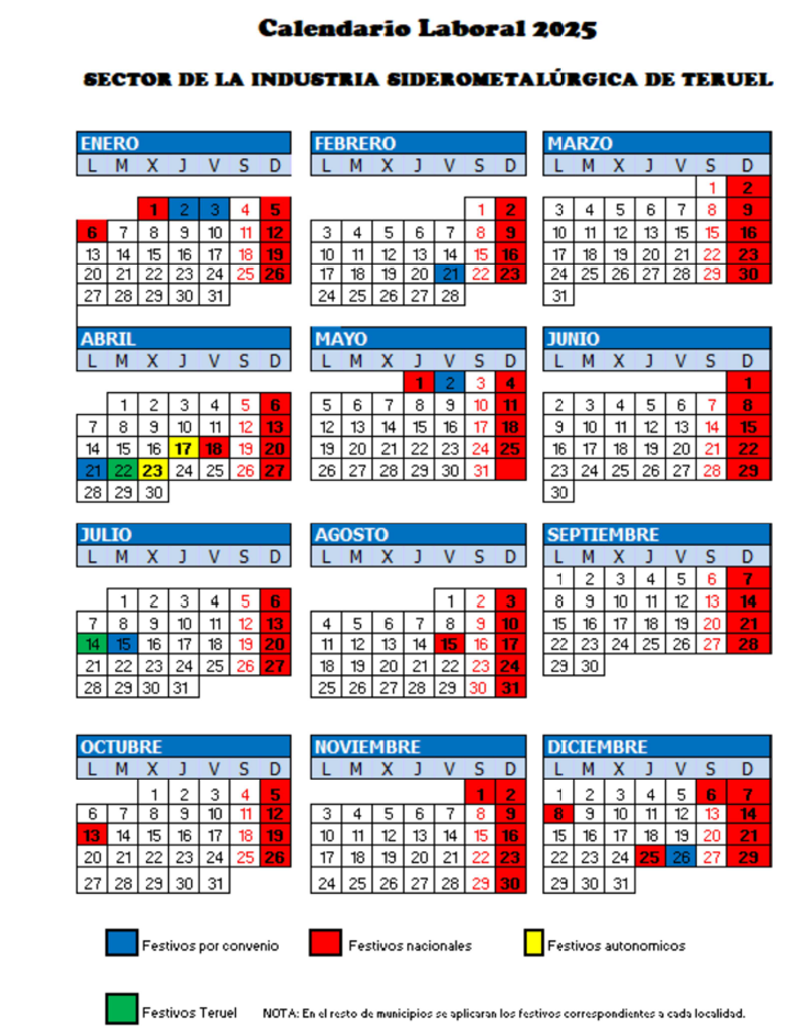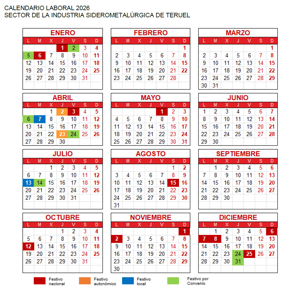 A) Confeccionar el Calendario Laboral para el Sector de la Industria Siderometalúrgica de la provincia de Teruel para el año 2026, en los siguientes términos: