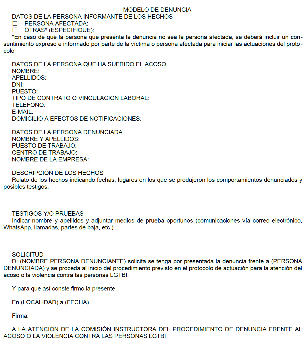 Se pone a disposición de las personas trabajadoras de la empresa el modelo que figura en este protocolo para la formalización de la denuncia o reclamación. La presentación de la denuncia o reclamación mediante el formulario correspondiente será necesaria para el inicio del procedimiento en los términos que consta en el apartado siguiente.