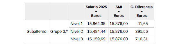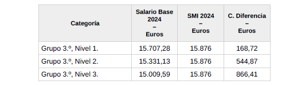 Dado que el importe del salario base fijo del Grupo 3.º referenciado (el «Salario 2025») es inferior al salario mínimo interprofesional actualmente vigente (el «SMI»), se acuerda que, por el momento, y a expensas de si finalmente se devengan los variables adicionales A y B de 2025, a las personas trabajadoras encuadradas en tal Grupo 3.º, se les abonará a cuenta del incremento que finalmente se acuerde, en su caso, la cantidad que corresponda para que su retribución global alcance el SMI. A modo de ejemplo, en los casos en los que su retribución se corresponda con el Salario 2025, la cantidad a abonar será la indicada en la columna «C. Diferencia»: