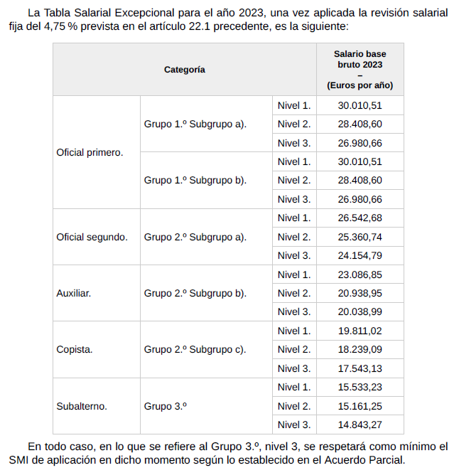 Los importes indicados en la tabla salario base bruto se corresponden con el salario base bruto anual total que habrán de percibir las personas trabajadoras con contratos a jornada completa a los que les sea de aplicación este convenio. Dentro de dicho importe se entienden incluidas las pagas extras a las que las personas trabajadoras pudieran tener derecho. El Convenio Estatal de Notarios y personal empleado prevé en su artículo 21 que, en defecto de pacto, dicha retribución bruta anual se abonará en 12 pagas ordinarias y 3 pagas extraordinarias, si bien las partes podrán acordar libremente el prorrateo de las pagas extraordinarias en 12 mensualidades.