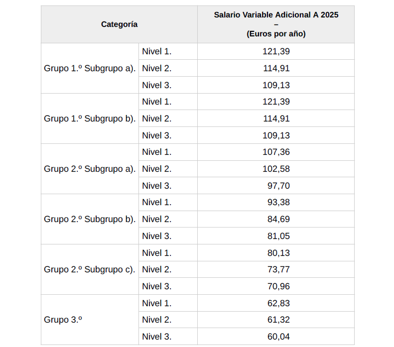 El Variable Adicional A para el año 2025, atendiendo a que se ha producido un incremento superior al 1 % en 3 de los 6 indicadores de Grupos referidos en el artículo 22.2.b), del año 2024 con respecto al año previo 2023, es el siguiente: