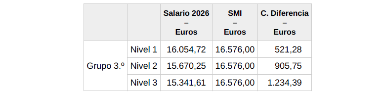 Dado que el importe del salario base fijo del Grupo 3.º referenciado (el «Salario 2026») es inferior al salario mínimo interprofesional actualmente vigente (el «SMI»), se acuerda que, por el momento, y a expensas de si finalmente se devengan los variables adicionales A y B de 2026, a las personas trabajadoras encuadradas en tal Grupo 3.º, se le abonará a cuenta del incremento que finalmente se acuerde, en su caso, la cantidad que corresponda para que su retribución global alcance el SMI. A modo de ejemplo, en los casos en los que su retribución se corresponda con el Salario 2026, la cantidad a abonar será la indicada en la columna «C. Diferencia»: