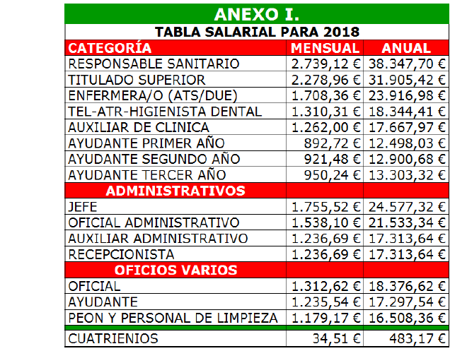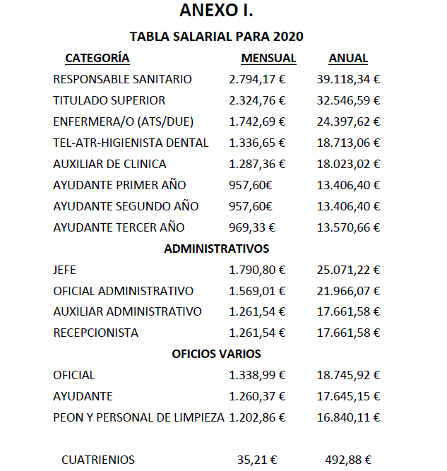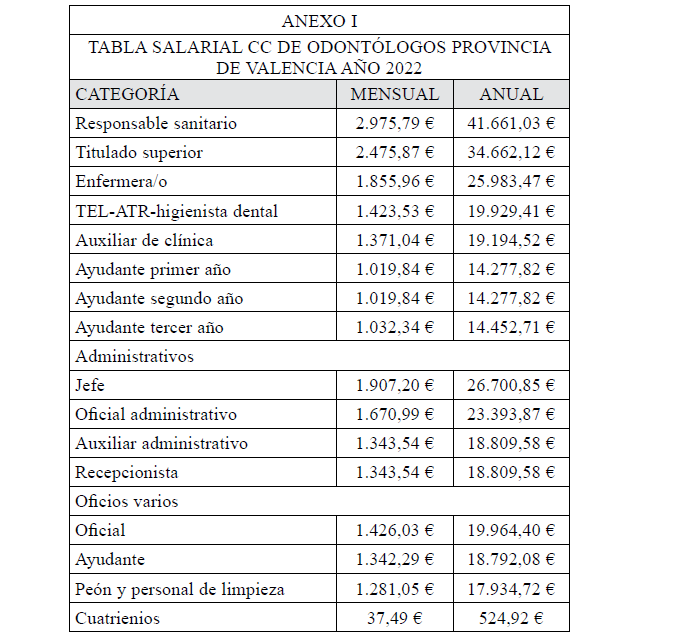 1. A los efectos de dar cumplimiento de lo establecido en el último párrafo del Art. 37, del Convenio Colectivo de trabajo del sector de Estomatólogos y Odontólogos de la Provincia de Valencia, se aprueban por unanimidad para su publicación y demás efectos, las tablas salariales que se adjuntan a la presente acta como anexo I.