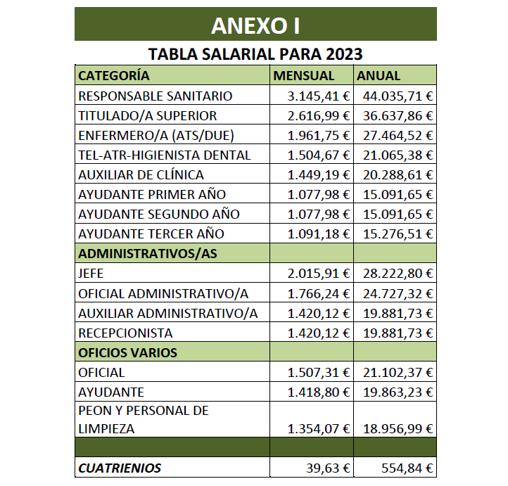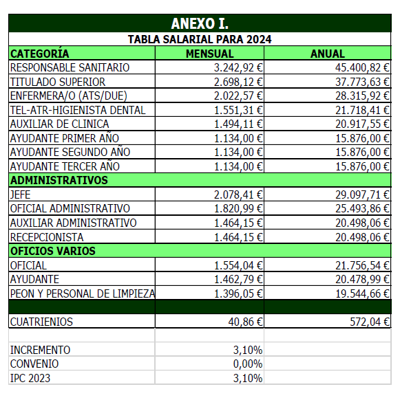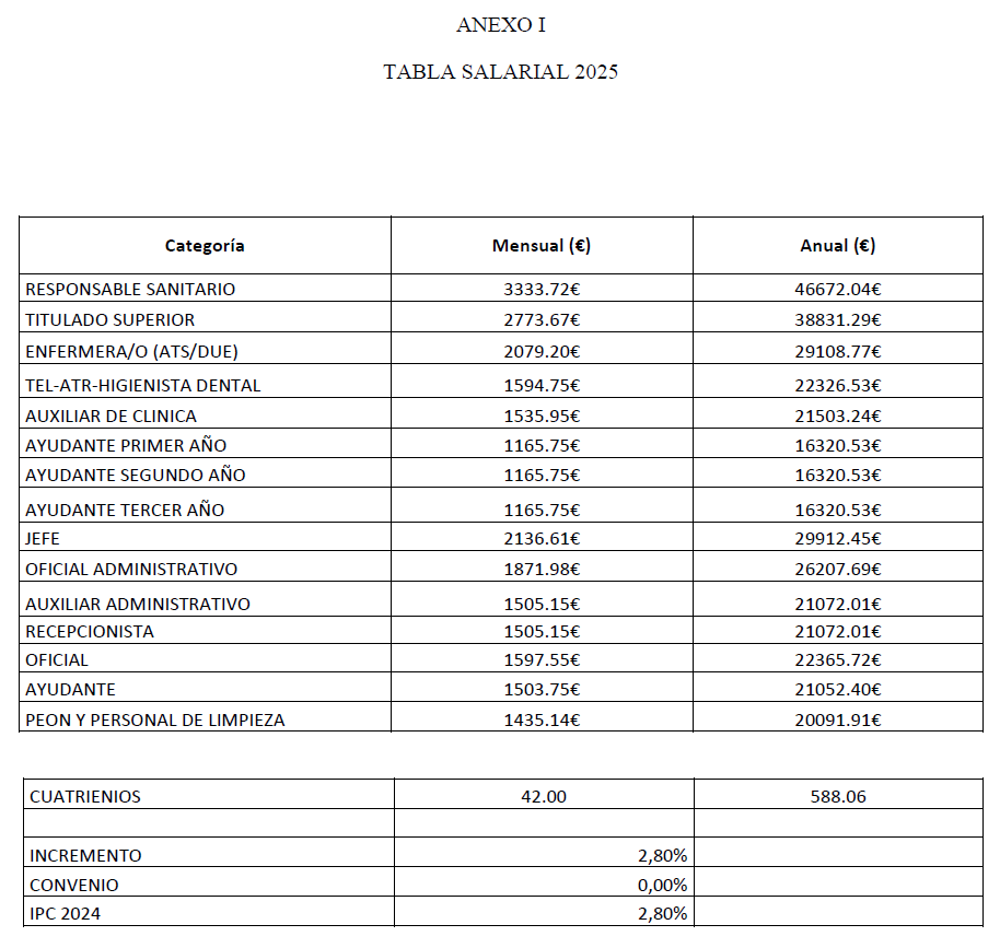 En Valencia, a 20 de febrero de 2025 Dª Ana Mª Sánchez Torres, responsable de de Sanidad Privada de FSS CCOO PV y y D. Miguel Ángel García Martínez, responsable de Sanidad Privada de FSP UGT PV, adjunto remitimos, para su publicación en el BOP, las Tablas Salariales del Convenio Colectivo de Odontólogos y Estomatólogos de la provincia de Valencia (46004455011994 ), publicado en el BOP de 07 de febrero de 2018.
