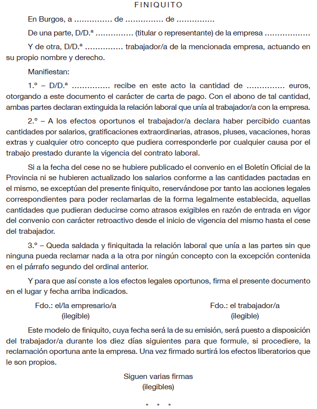 Tercera. – A efectos de unificar la documentación acreditativa de la liquidación de cuentas por la extinción de la relación laboral se establece el modelo de finiquito siguiente: