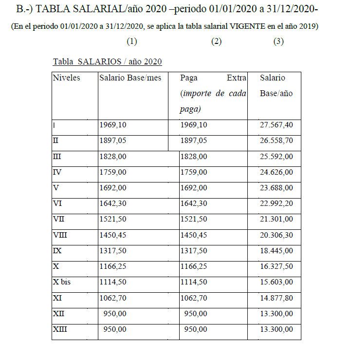 2.) Para el año 2020 (Periodo 01/enero a 31 diciembre/2020) . NO SE INCREMENTA LA TABLA SALARIAL vigente a fecha 31/12/2019, la cual queda establecida en dicho ejercicio conforme se recoge en el apartado B) Tabla Salarial /año 2020.