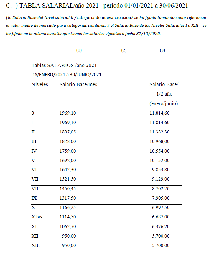3.) Para el año 2021 (Periodo 01/enero a 31 diciembre/2021) , se efectuará, CON EFECTOS DE FECHA 1º/JULIO/2021, una revisión del salario base mes de cada Nivel salarial vigente a fecha 31.12.2020 ; aplicando a dicho salario base ( vigente a fecha 31.12.2020) un porcentaje de incremento del 1,5 % ; quedando establecidas las tablas salariales en los periodo 01/01/2021 a 30/06/2021 y 01/07/2021 a 31/12/2021, conforme se recoge en los apartados C) y C.1) Tablas Salariales/año 2021.