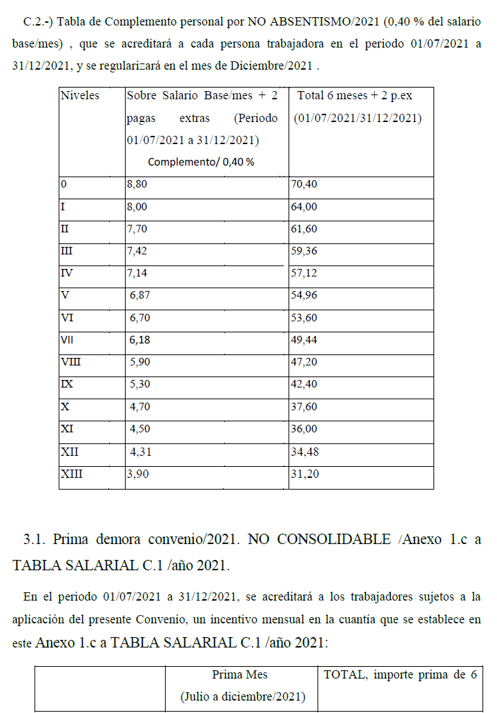 Complemento personal por NO ABSENTISMO : Así mismo EN EL PERIODO TEMPORAL 01-07-2021 a 31-12-2021 ; se establece el abono de un complemento personal por NO ABSENTISMO) para todas las personas trabajadoras de las empresas afectadas por este Convenio , complemento que NO TIENE CARÁCTER de SALARIO Convenio , y tendrá una cuantía del 0,40 % sobre el importe del salario base/mes y pagas extraordinarias devengadas por cada persona trabajadora ( Conforme recoge el apartado C.2 / Tabla de Complemento personal por NO ABSENTISMO / año 2021) .Este Complemento personal por NO ABSENTISMO se reflejará en la nómina de la persona trabajadora con esta misma denominación identificadora, y se acreditará mensualmente a lo largo del PERIODO DE DEVENGO DEL MISMO (01-07-2021 a 31-12-2021) con el carácter de pago a cuenta por NO ABSENTISMO, pagos que se regularizarán ,en su caso, en el mes de diciembre, conforme se indica en el párrafo siguiente.