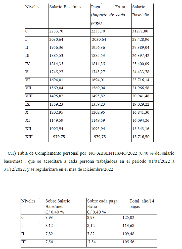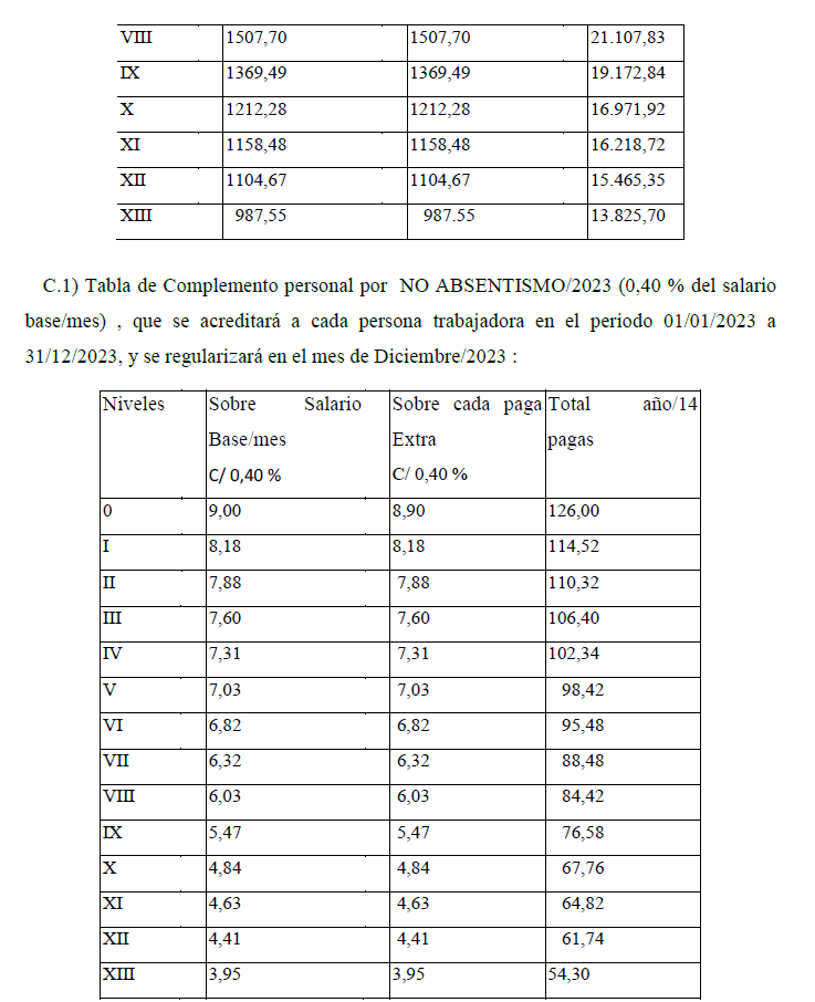 Se acuerdan para los años de vigencia del Convenio las siguientes Tablas Salariales Básicas y de porcentajes (%) complementarios por NO ABSENTISMO: