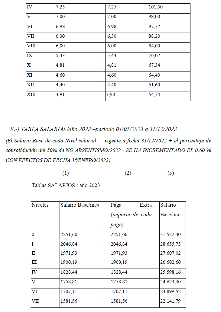 5.) Para el año 2023 (01/enero a 31 diciembre/2023), se efectuará una revisión del salario base mes de cada Nivel salarial vigente a fecha 31.12.2022, incrementado en el 0,20, por consolidación del 50 % del porcentaje convenido por NO ABSENTISMO para el año 2022; aplicando a dicho salario base consolidado un porcentaje de incremento del 0,60 %, quedando establecida la tabla salarial en el ejercicio 2023, conforme se recoge en el apartado E) Tabla Salarial/año 2023.