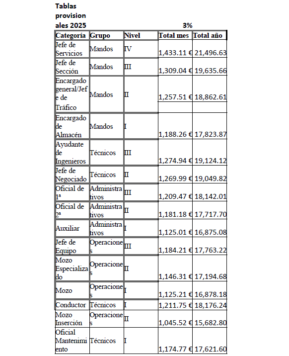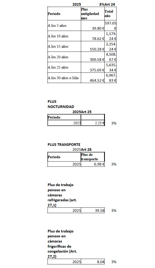 PRIMERO.- La partes ACUERDAN firmar las tablas salariales provisionales 2025 del Convenio de Operadores Logísticos de Sevilla que se detallan a continuación: