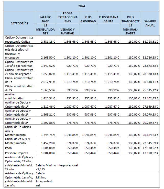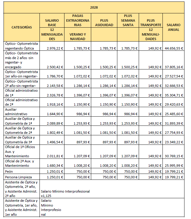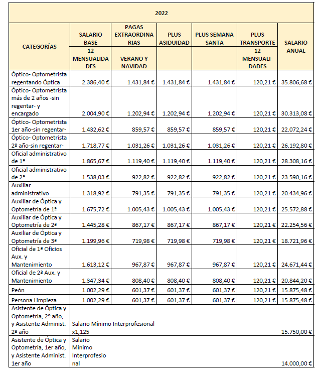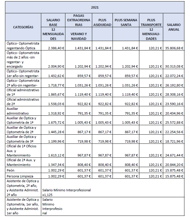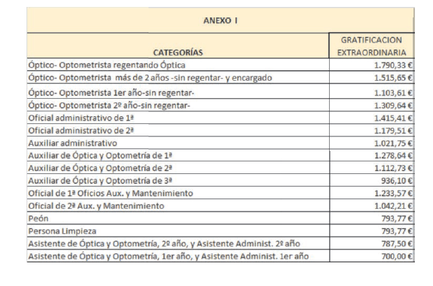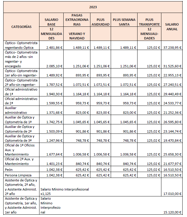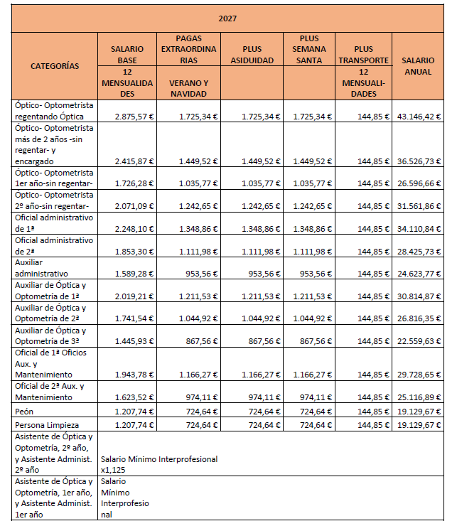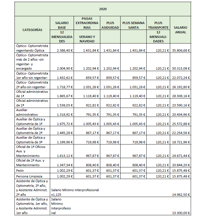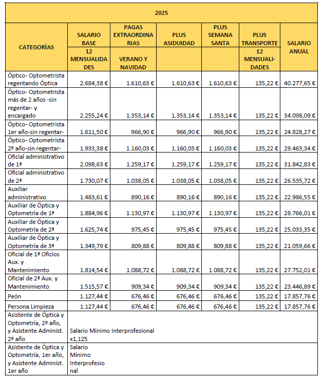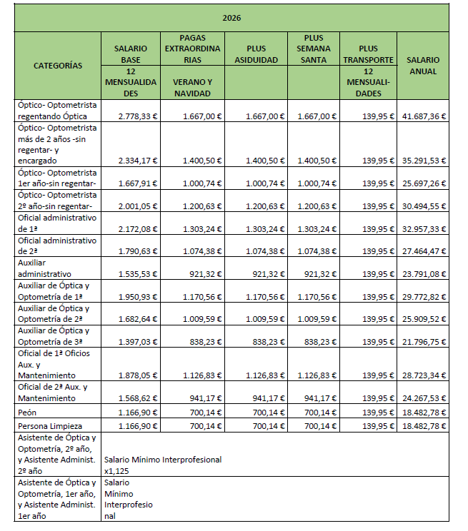 – Asistente de óptica y optometría de 1.er o de 2.º año: Se trata de un trabajador sin experiencia que bajo la supervisión general de un Óptico-Optometrista, asiste y practica con un Auxiliar de Óptica y Optometría o con un Óptico-Optometrista. Al llevar 2 años en la empresa, ascenderá a Auxiliar de Óptica y Optometría de 3.ª.