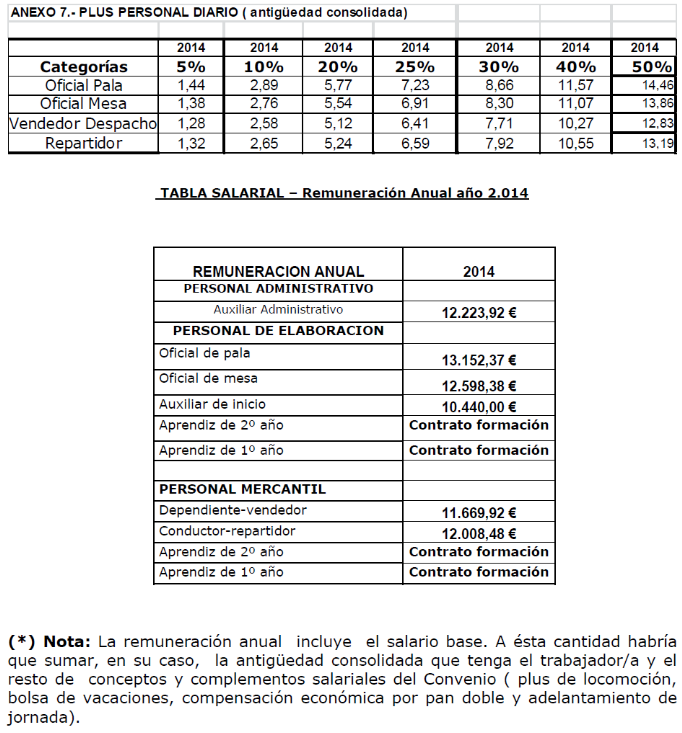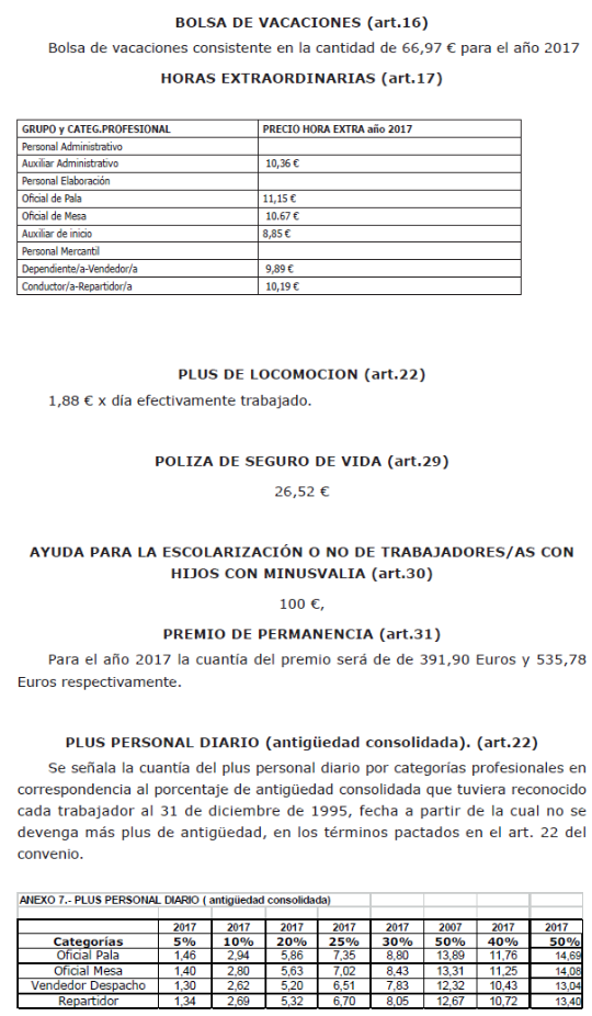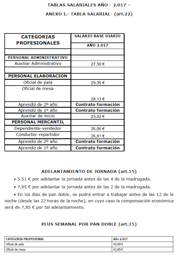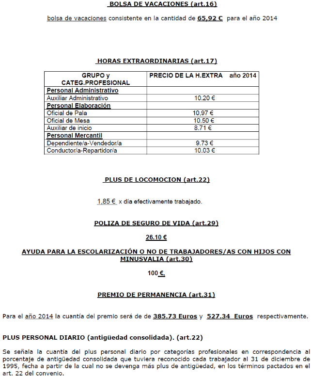 En virtud de lo dispuesto en el art. 26.3 del ET, se hace constar las tablas de salarios y demás conceptos económicos en función de las 1.798 horas efectivas de trabajo para los años de vigencia del presente Convenio Colectivo, y las distintas categorías profesionales, es la siguiente: