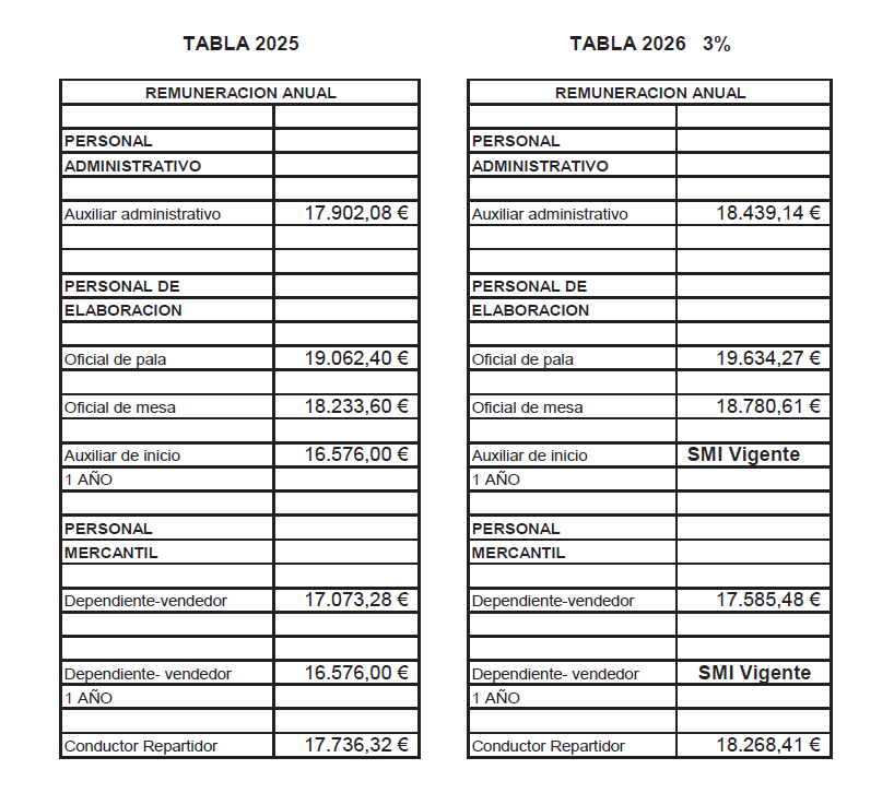 Tras debate las partes acuerdan la publicación de las tablas salariales para los años 2025 (1 junio) y 2026, que se adjuntan al presente acta, incorporando dos nuevas categorías que vienen detalladas en las mismas: Auxiliar de inicio de dependiente y Auxiliar de inicio de elaboración con un año de permanencia en la categoría para las nuevas contrataciones, tal y como consta en las propias tablas.