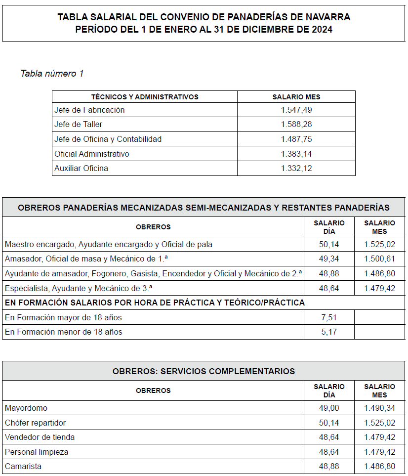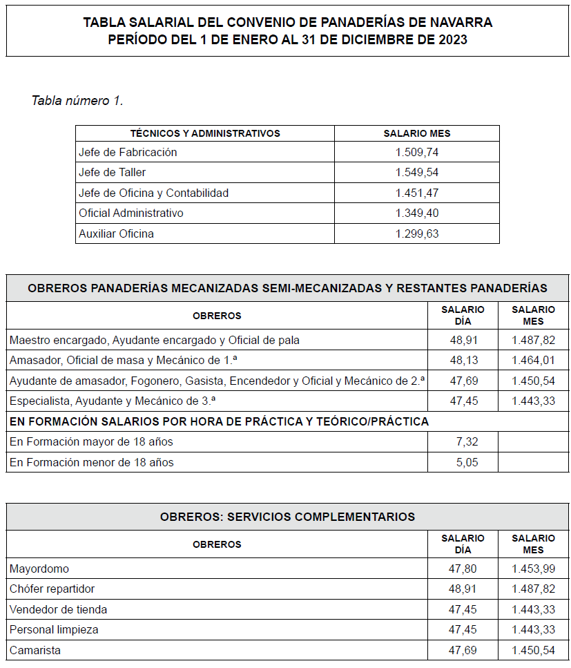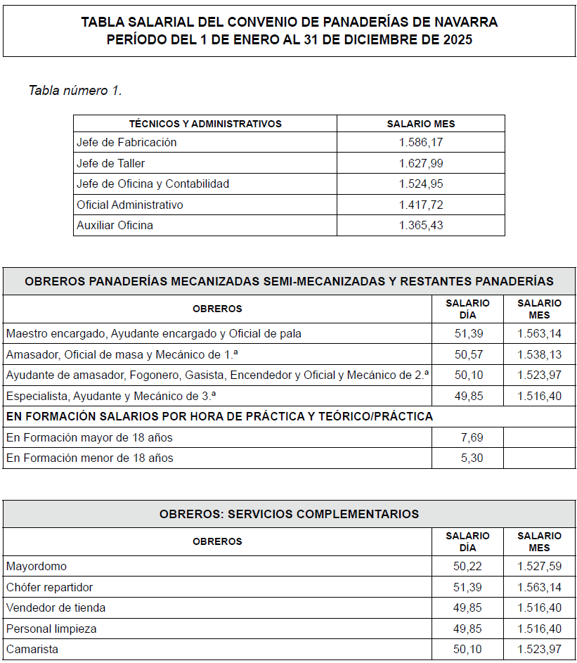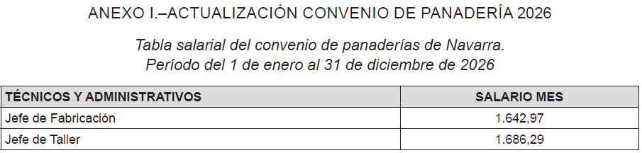En consecuencia, la representación de la Asociación de Empresarios Fabricantes y Expendedores de Pan de Navarra y las Centrales Sindicales UGT y CCOO aprueban y suscriben las tablas salariales del Convenio Colectivo de Fabricantes y Expendedores de Pan de Navarra (código de convenio 31005305011981), que tendrán vigencia desde el 1 de enero de 2026, y que se adjuntan como anexo I al presente acuerdo.