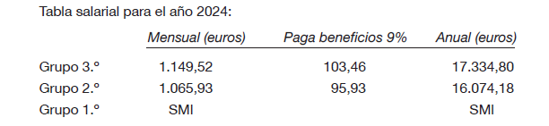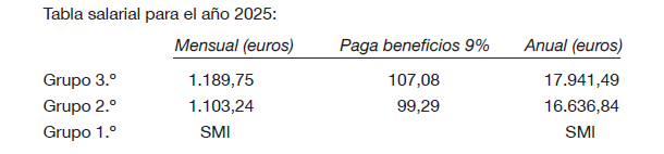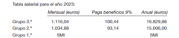 Los salarios para el grupo 3.º (oficial de I) y grupo 2.º (oficial de II) se incrementan tal y como se indica en los artículos siguientes a razón de un 2% para 2023 (salvo en el plus de antigüedad), un 3% para 2024 (incluida la antigüedad) y un 3,5% para 2025 (incluida la antigüedad). Los salarios para el grupo 1.º (oficial de III) se incrementarán conforme a las subidas del SMI vigente para cada año.