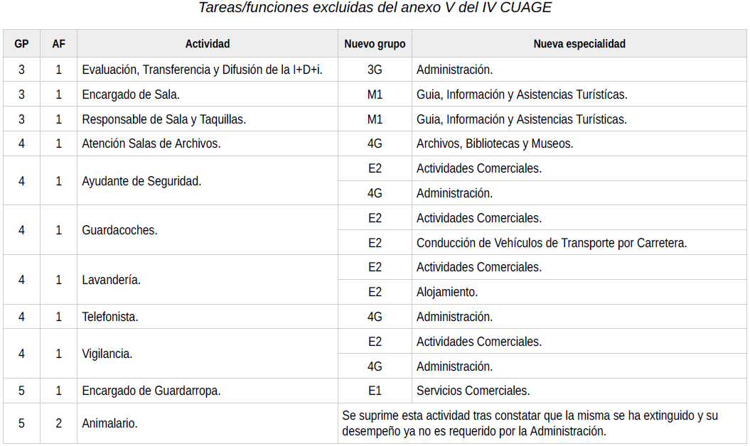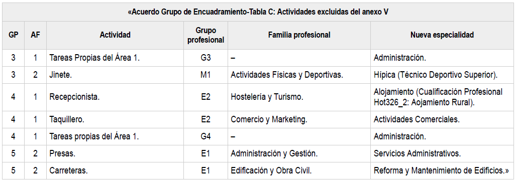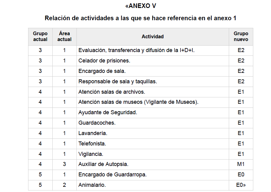 – Modificación del anexo V por haberse detectado la existencia de titulaciones, que permite su encuadramiento en grupo distinto al señalado en el anexo V. Se eliminarían del anexo las siguientes actividades: