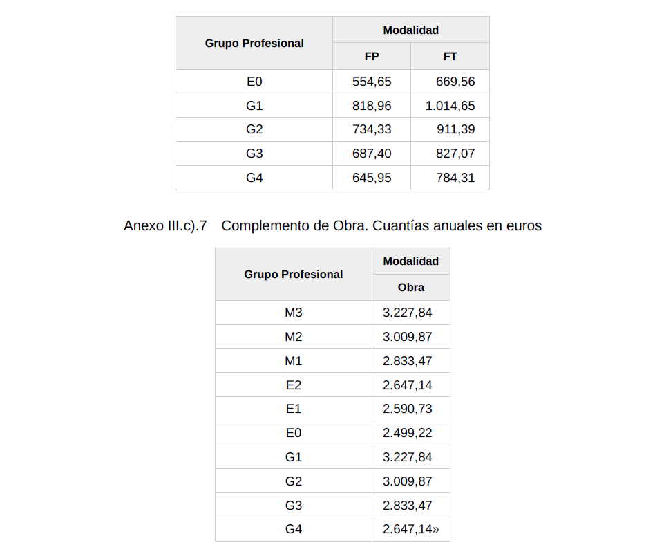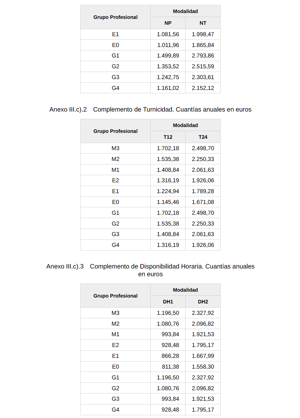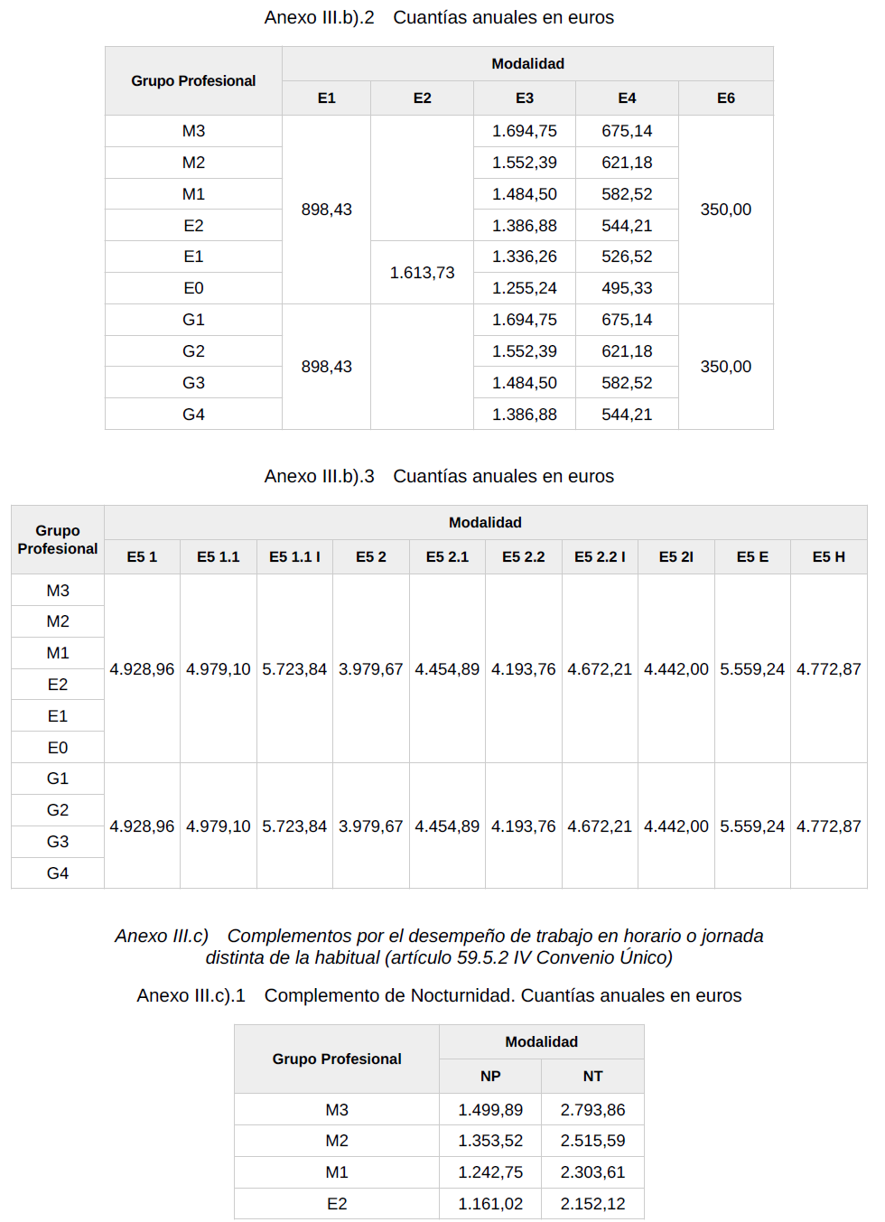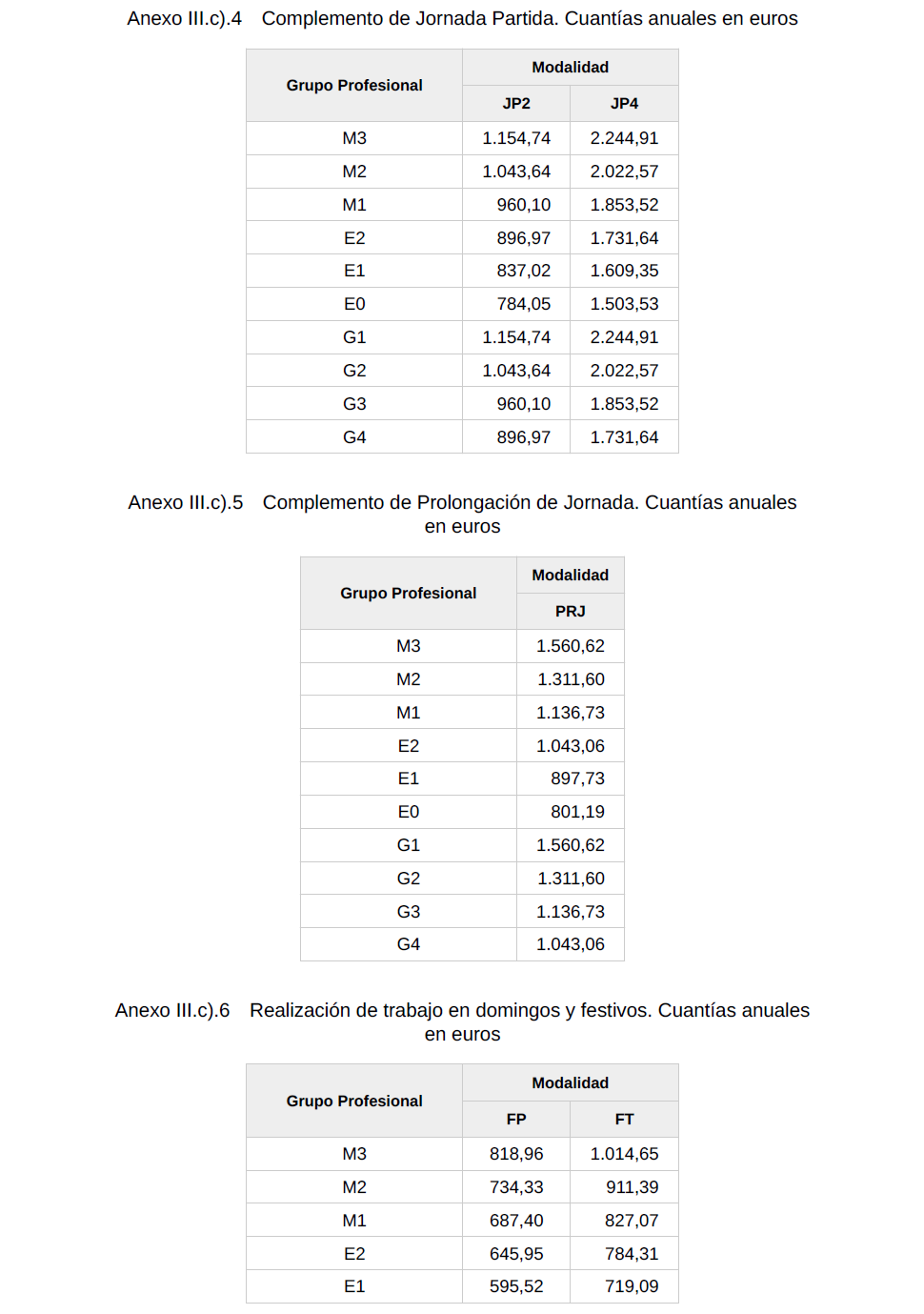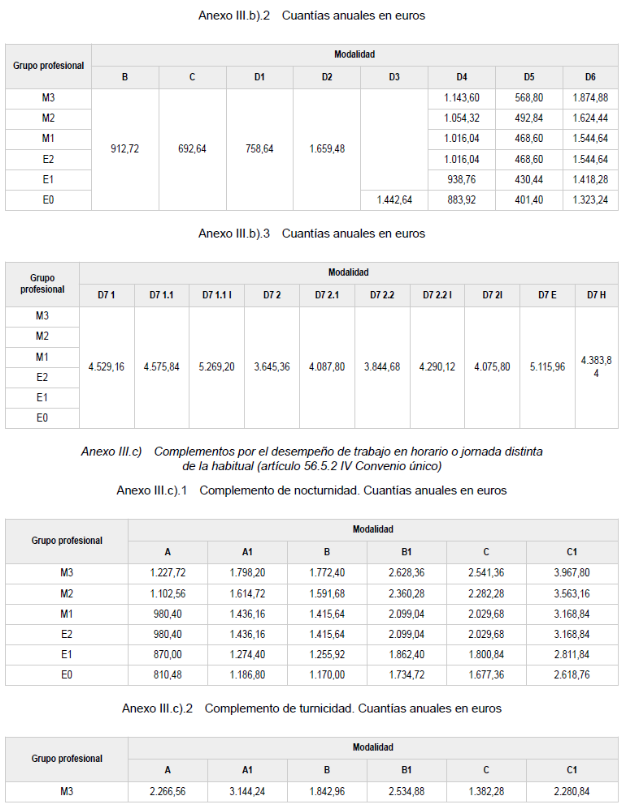5.2.8 Las cuantías de las modalidades de los complementos por el desempeño de trabajo en horario o jornada distinta de la habitual se fijan en función del grupo profesional y de las condiciones específicas de trabajo que en cada caso retribuyen, según los valores del anexo III.c).