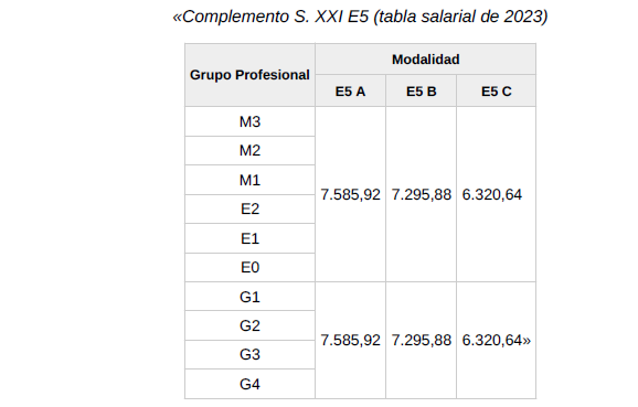 El apartado quinto del Acuerdo de 1 de marzo de 2023 de la Mesa General de Negociación de la Administración General del Estado por el que se adoptan medidas para la revisión del modelo organizativo de la administración penitenciaria establece tres nuevas tipologías del complemento singular de puesto E5 del artículo 59.5.1.2 y del anexo III.b.3 del IV Convenio Único para el Personal Laboral de la Administración General del Estado, aplicable a dicho personal laboral de Instituciones Penitenciarias. El apartado séptimo de dicho Acuerdo establece a su vez que una vez concluidos y autorizados los trabajos organizativos, homogeneizadores, caracterizadores y descriptivos de los puestos de la RPT de Instituciones Penitenciarias, el «Complemento S. XXI» se dejará de percibir de manera diferenciada y que el importe que en ese momento resulte del apartado quinto quedará integrado en el complemento E5 del personal laboral, de la respectiva RPT, con efectos de 1 de enero de 2025.