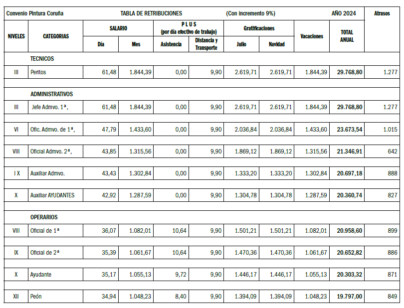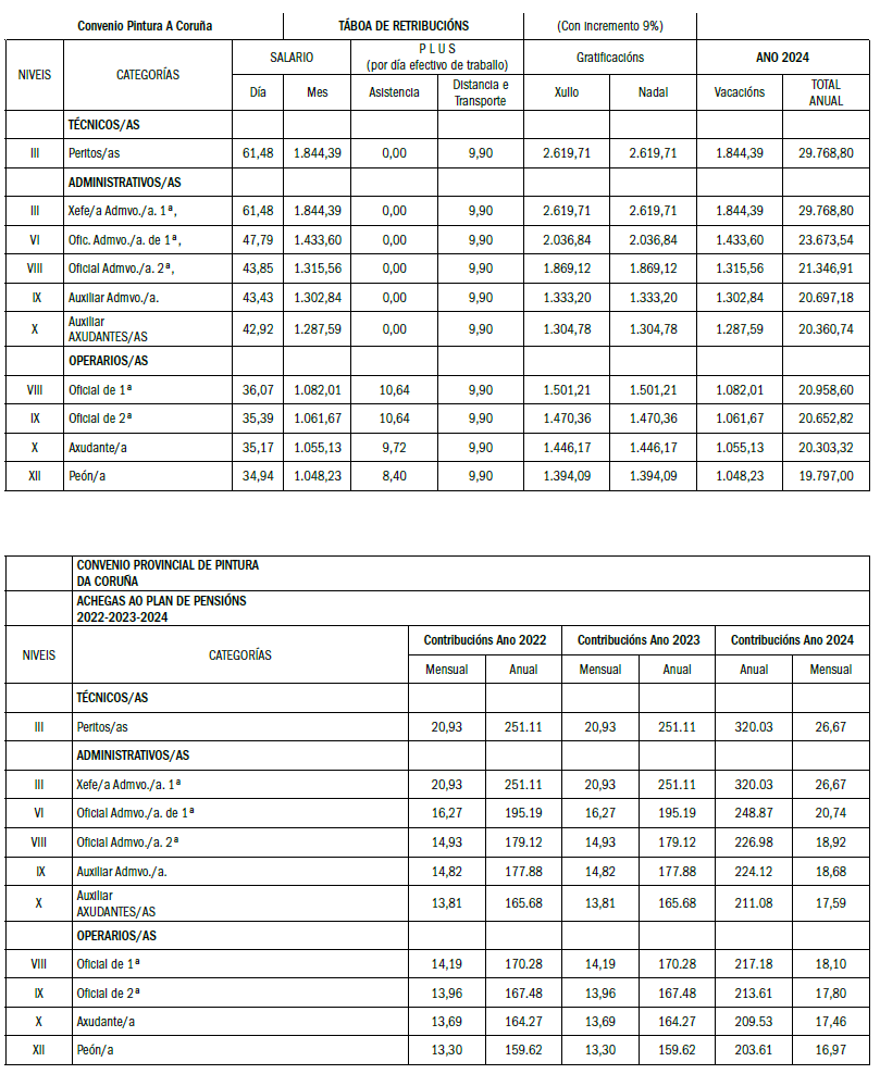 As categorías de «Oficial Administrativo/a 2ª» e «Auxiliar Administrativo/a» están topadas polos seus correspondentes niveis nas táboas da construción da Coruña, por iso a porcentaxe de incremento queda algo por baixo do 9% que se aplica ás demais Categorías deste Convenio.