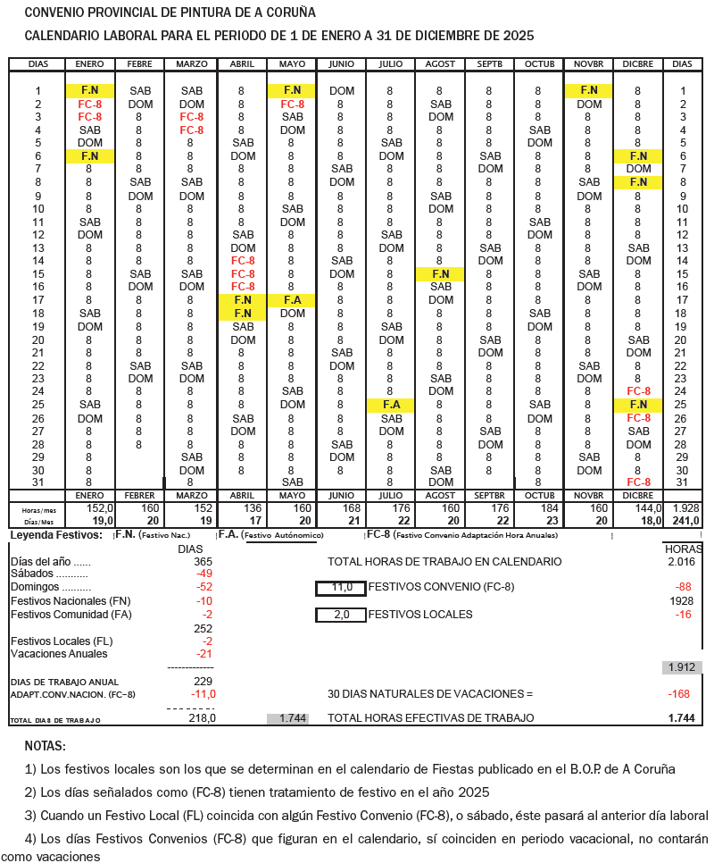 O 23 de outubro de 2024 tivo entrada no rexistro de acordos e convenios colectivos de traballo da Comunidade Autónoma de Galicia (REGCON) o acordo da comisión paritaria do convenio colectivo de pintura da provincia da Coruña relativo ao calendario laboral para 2025, código de convenio 15001185011981.