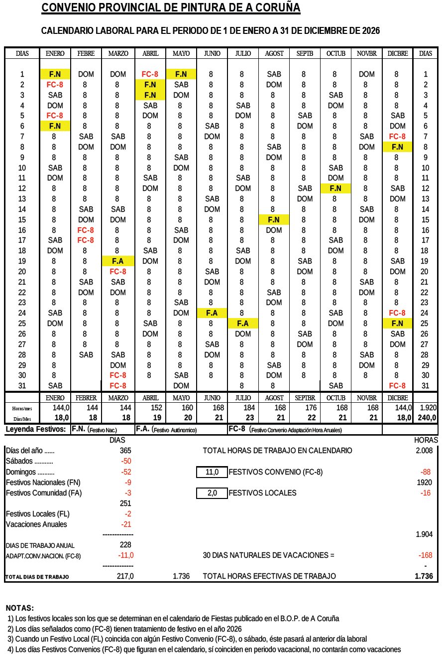 O 5 de decembro de 2025 tivo entrada no rexistro de acordos e convenios colectivos de traballo da Comunidade Autónoma de Galicia (REGCON) o acordo da comisión paritaria do convenio colectivo de pintura da provincia da Coruña relativo ao calendario laboral para 2026, código de convenio 15001185011981.