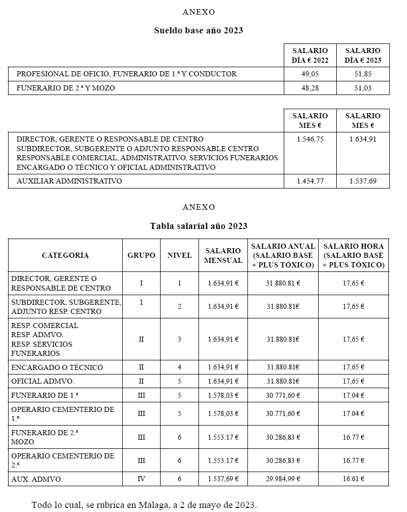 ACUERDO DE REVISIÓN SALARIAL DEL CONVENIO COLECTIVO DE TRABAJO PARA LA ACTIVIDAD DE POMPAS FÚNEBRES DE MÁLAGA Y PROVINCIA.