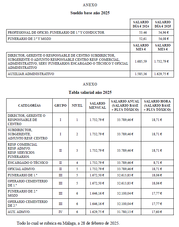 En Málaga, a 28 de enero de 2025, siendo las 17:00 horas, se reúnen, de una parte una representación de la Asociación Empresarial de Pompas Fúnebres de Málaga y, de otra la representación de los trabajadores, para proceder a la actualización de todos los conceptos económicos del Convenio Colectivo de Trabajo para la actividad de Pompas Fúnebres de Málaga y provincia, con una subida del 2,8 % correspondiente al IPC del año anterior.
