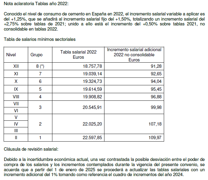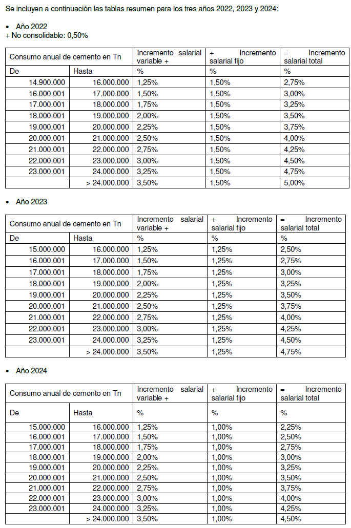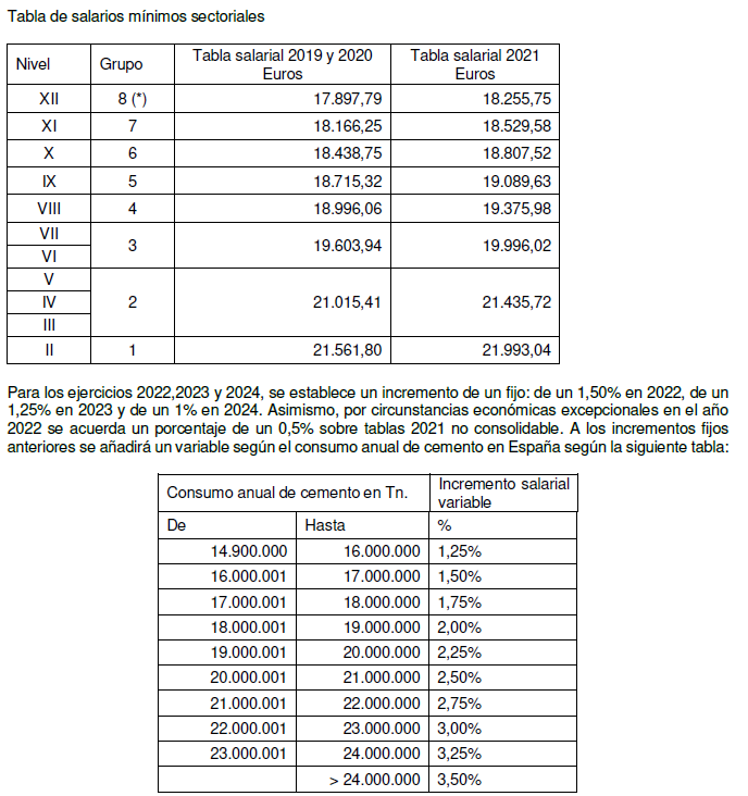 A 15 de diciembre de 2021, el convenio general acuerda suscribir el acuerdo salarial del año 2021, basándose en las siguientes circunstancias: en primer lugar la patronal desea dejar patente el reconocimiento a los personas trabajadoras del sector en circunstancias tan excepcionales como las vividas durante la pandemia en 2020, acordándose un abono de un emolumento extraordinario del 0,5%; a ello es preciso añadir el incremento salarial debido al aumento de consumo de cemento de 2021, que se estima está en la horquilla de +1,5%, según la tabla de la Disposición final primera del VII Convenio General del Sector de Derivados del Cemento, prorrogándose durante 2021 todos los términos del VII Convenio. De esta forma, el incremento salarial acordado para 2021 es de +2% sobre las tablas de 2019 (y de 2020 solo para aquellas provincias que hayan actualizado las tablas salariales 2020), con efectos desde el día de la firma, con independencia de su fecha de publicación en el BOE y todo ello con carácter retroactivo desde 1 de enero de 2021, siendo pagaderos los atrasos en el primer trimestre de 2022: