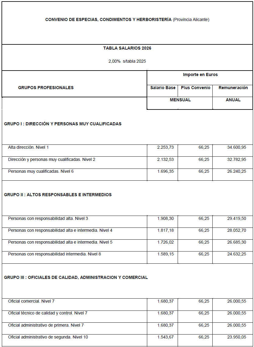 Con fecha 27/02/2026 se remitió al Registro de Convenios de Alicante la solicitud de registro, depósito y publicación de las tablas salariales definitivas para el año 2025 y provisionales para el año 2026 respecto del convenio colectivo para el sector de Preparados de Especias, Condimentos y Herboristería de la Provincia de Alicante para el año 2026. El acuerdo fue suscrito, por la parte empresarial, por la representación de la Asociación de Empresas de Especias, Condimentos e Infusiones de la Comunidad Valenciana (APRECOIN) y, por la parte social, por el Sindicato Confederación Independiente Fetico de la Provincia de Alicante (FETICO-SITPA) y el Sindicato Unión General de Trabajadoras y Trabajadores (UGT-FICA).