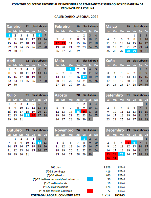 Apróbase o Calendario Laboral para o ano 2024, que comprenderá un total de MIL SETECENTAS CINCUENTA E DÚAS (1.752) horas efectivas de traballo.