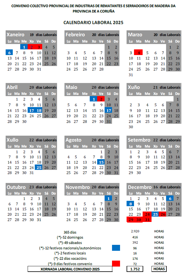 Apróbase o Calendario Laboral para o ano 2025, que comprenderá un total de MIL SETECENTAS CINCUENTA E DÚAS (1.752) horas efectivas de traballo.