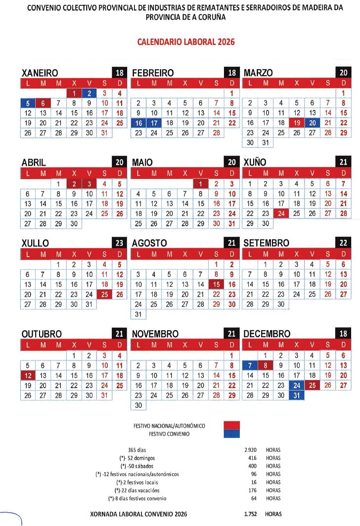 O 17 de novembro de 2025 tivo entrada no rexistro de acordos e convenios colectivos de traballo da Comunidade Autónoma de Galicia (REGCON) o acordo da comisión negociadora do convenio colectivo provincial de industrias de rematantes e serradoiros de madeira da provincia de A Coruña relativo ao calendario laboral para 2026, código de convenio 15001235011982.
