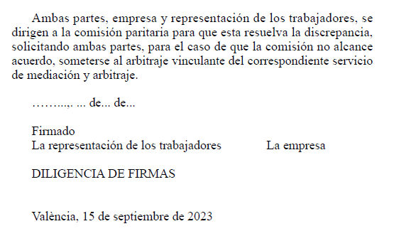 No obstante lo anterior, en aquellos supuestos en los que la Comisión Paritaria no alcance acuerdo en relación a las cuestiones que dentro de sus competencias les sean planteadas al margen de las recogidas en el anterior apartado 1, letras g y h, y en cuanto a la inaplicación de las condiciones de trabajo, trasladarán, en su caso, las discrepancias a los sistemas de solución extrajudicial de conflictos, asumiendo el quinto Acuerdo sobre Solución Autónoma de Conflictos laborales (ASAC), y al correspondiente acuerdo en el ámbito de la Comunitat Valenciana.