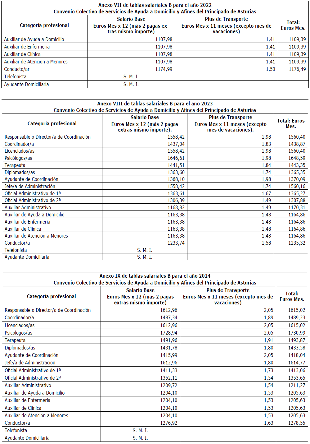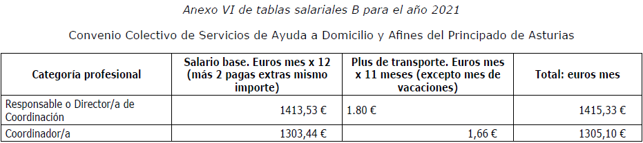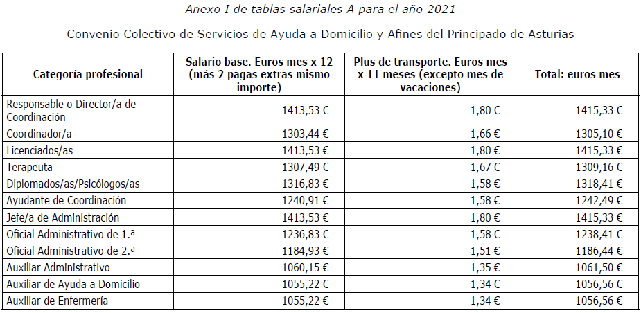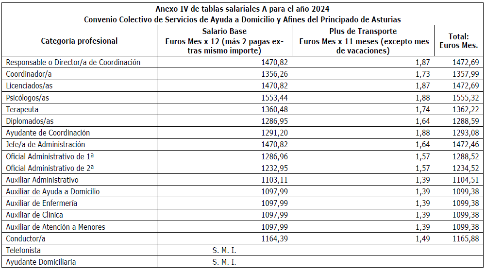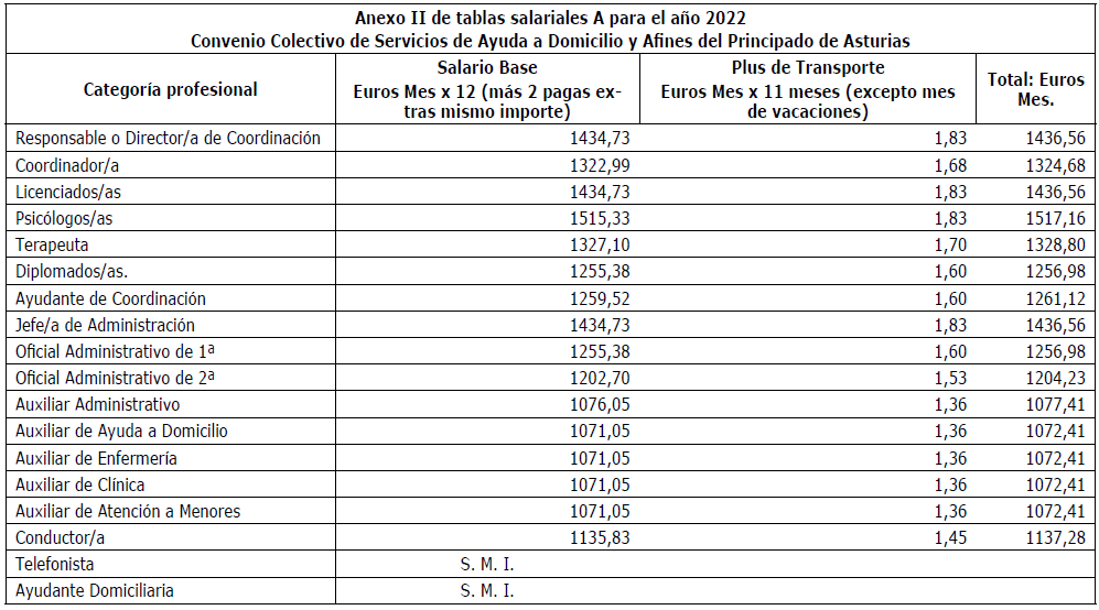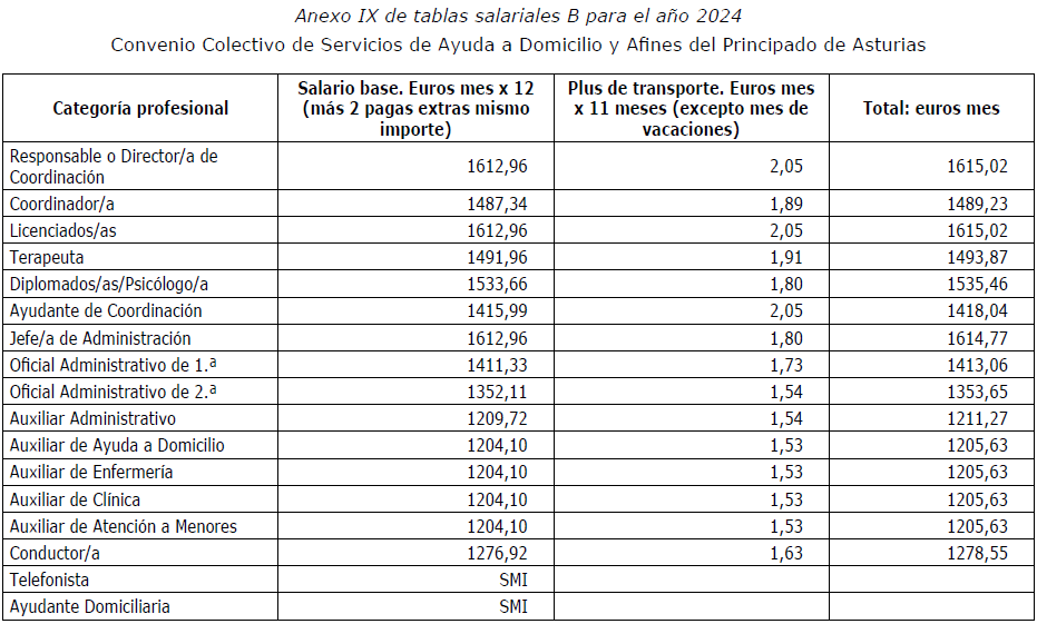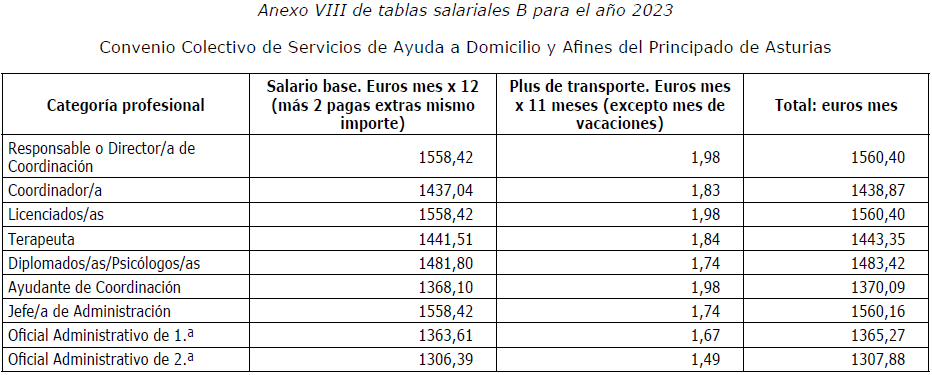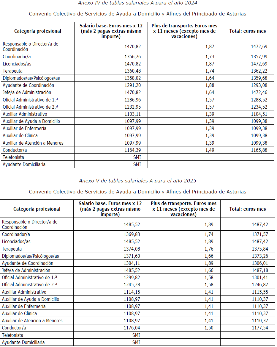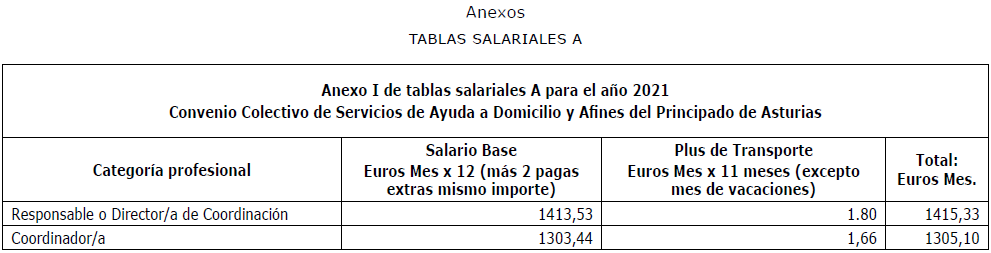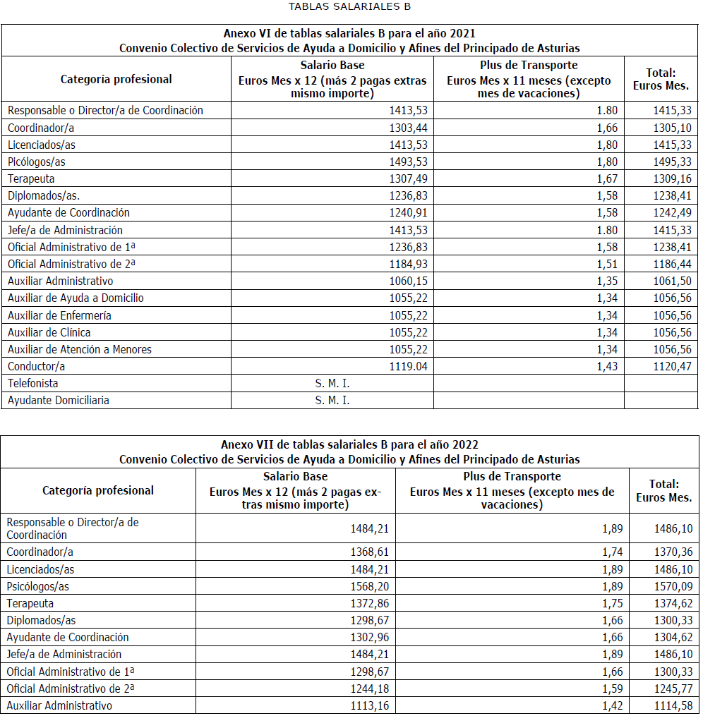 Primero.-Rectificar, a instancia de la Comisión Negociadora, el contenido de las tablas salariales (anexo I, II, III, IV, V, VI, VII, VIII, IX y X del convenio colectivo) de sector Servicios de Ayuda a Domicilio y Afines del Principado de Asturias, siendo las tablas salariales correctas las que a continuación se detallan: