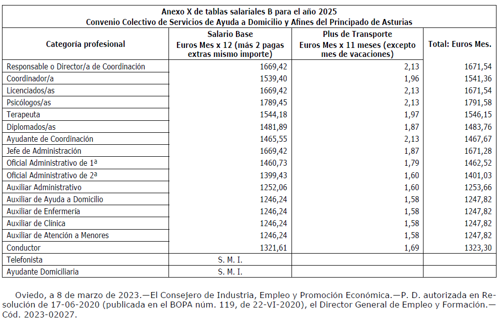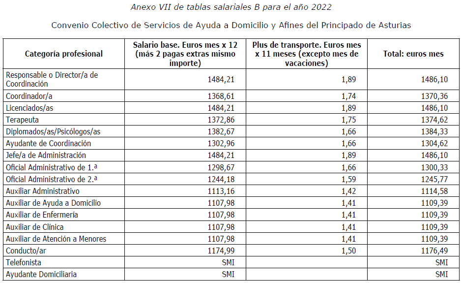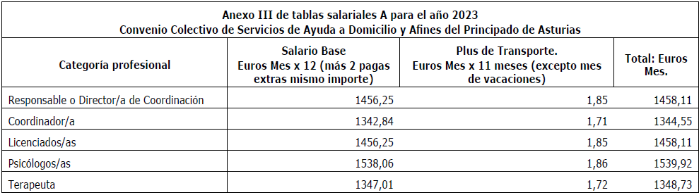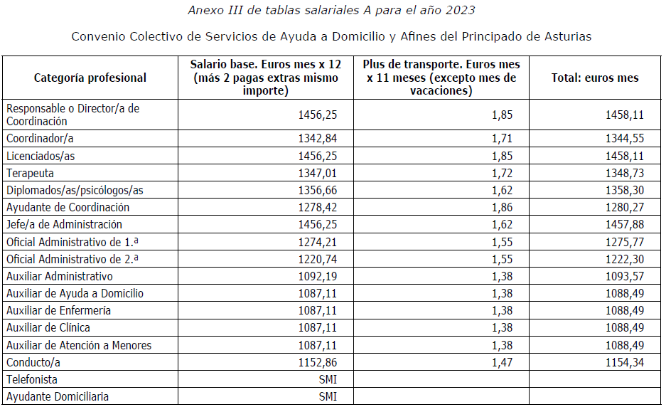 Visto el Acta de la Comisión Negociadora del convenio colectivo de sector Servicios de Ayuda a Domicilio y Afines del Principado de Asturias (Expediente C-031/2022, Código 33003535012000) de fecha 27 de enero de 2023, por la que se advierte error material de transcripción en el contenido de las tablas salariales (Anexos I, II , III , IV, V, VI, VII , VIII , IX y X del convenio colectivo) resultan los siguientes