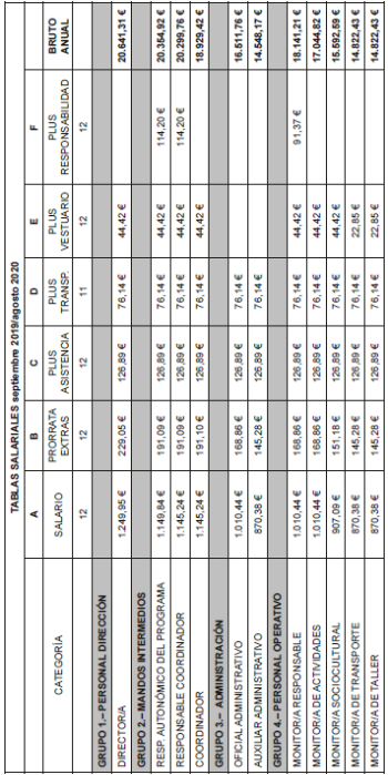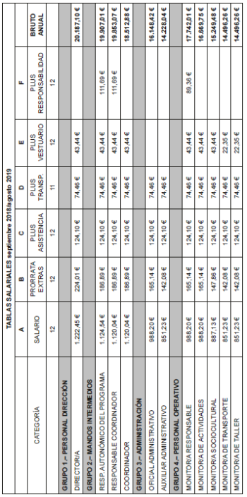 En concreto, desde el 1 de septiembre de 2018 hasta el 31 de agosto de 2019, será el reflejado en las tablas salariales anexas en la columna A de carácter mensual por 12 mensualidades, resultante de aplicar el 0,75% sobre las tablas de 2017.