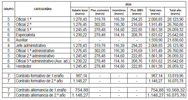 Primero.-De conformidad con lo previsto en el artículo 33 apartado 4.º, del vigente Convenio Colectivo, se conviene un incremento de 3,05% (la diferencia entre la suma de los IPCs 2018-2023 y la subida de las tablas salariales 2022-2024) sobre los conceptos salariales recogidos en las tablas de 2024 -salario base, plus convenio, plus carencia de incentivos y plus SMG-.