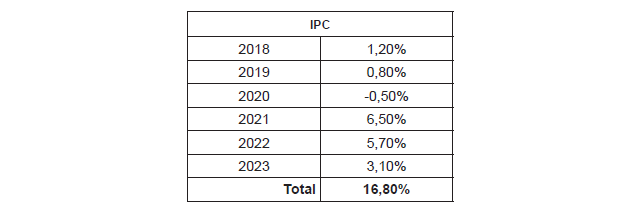 -La suma de los IPCs anuales de los años comprendidos entre 2018 y 2023, incluidos los negativos, fue del 16,8%, conforme al siguiente cálculo: