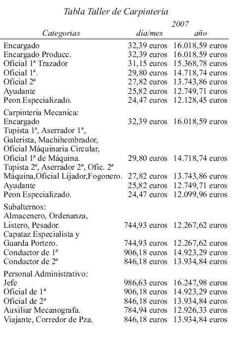 ANEXO A. TALLER DE CARPINTERÍA. TABLA Y DEMAS CONCEPTOS RETRIBUTIVOS.