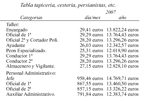ANEXO C. TAPICERIA, CESTERIA, MIMBRES, SILLERIA DE ANEA, BILLARES Y PLANOS, ESTUCHISTAS, BROCHAS, PINCELES, CEPILLOS CARROCERIAS, CARRETERIAS, ENTARIMADOS, HORNISTAS, ACUCHILLADORES Y ENCERADORES, PERSIANISTAS, CARPINTERIA DE RIBERA E INDUSTRIAS VARIAS. TABLA Y DEMÁS CONCEPTOS RETRIBUTIVOS