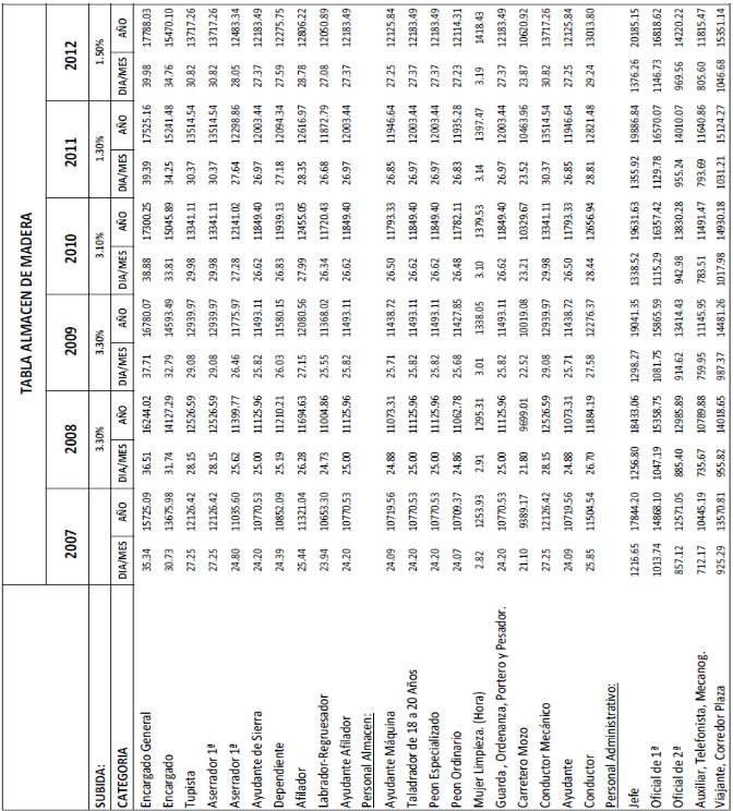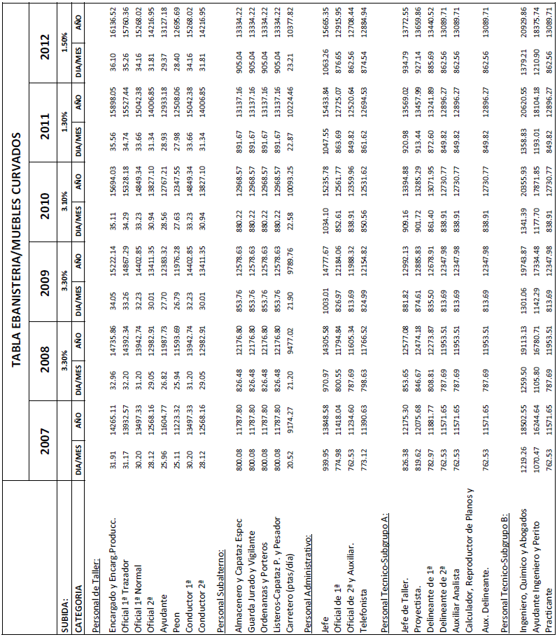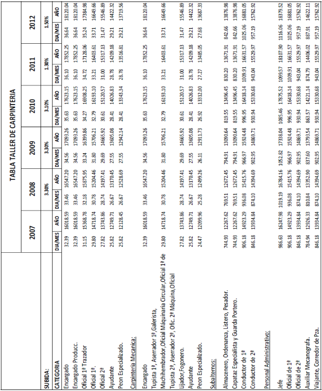 Se anexa al presente acta el resultado de los cálculos efectuados sobre las tablas del 2007, correspondientes a taller de carpintería, almacén de madera, tapicería y cestería, moldurería, talla, torno y modelaje y ebanistería y muebles curvados, de un incremento total acumulado del 12,5%, como resultado de la actualización pendiente desde el año 2007 hasta la actualidad.